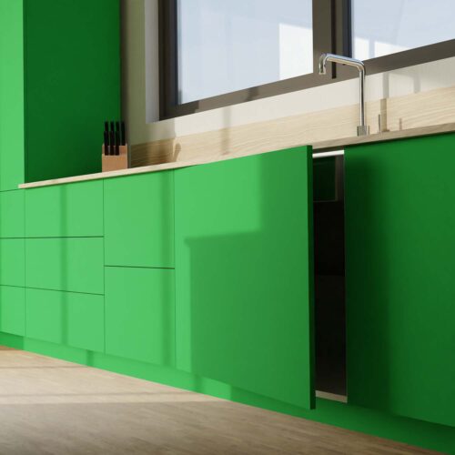 La couleur Vert Printemps pour une façade de cuisine est vivifiante et joyeuse, rappelant les premières feuilles de la saison.